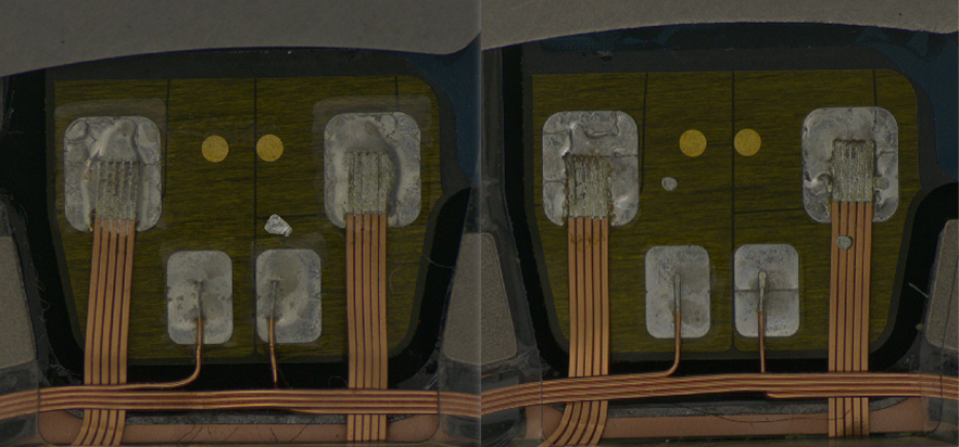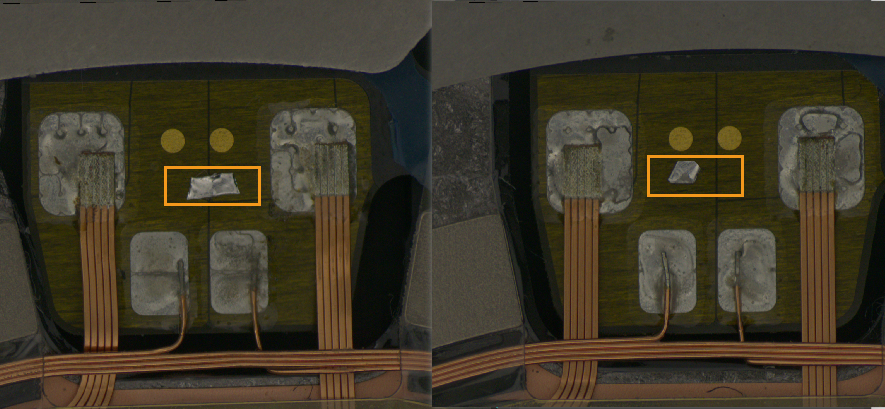 마스크 도구로 훈련 간섭 제거(선택 사항) : 결함 영역과 비결함 영역의 특징이 유사하거나 겹칠 경우, 마스크 도구를 사용해 훈련 방해 요소를 가릴 수 있습니다. 예를 들어, 과잉 솔더 결함과 주변 4개의 솔더 접합부는 외관과 반사 특성이 비슷하므로, 전체 이미지 마스크를 사용해 접합부를 가릴 수 있습니다.
