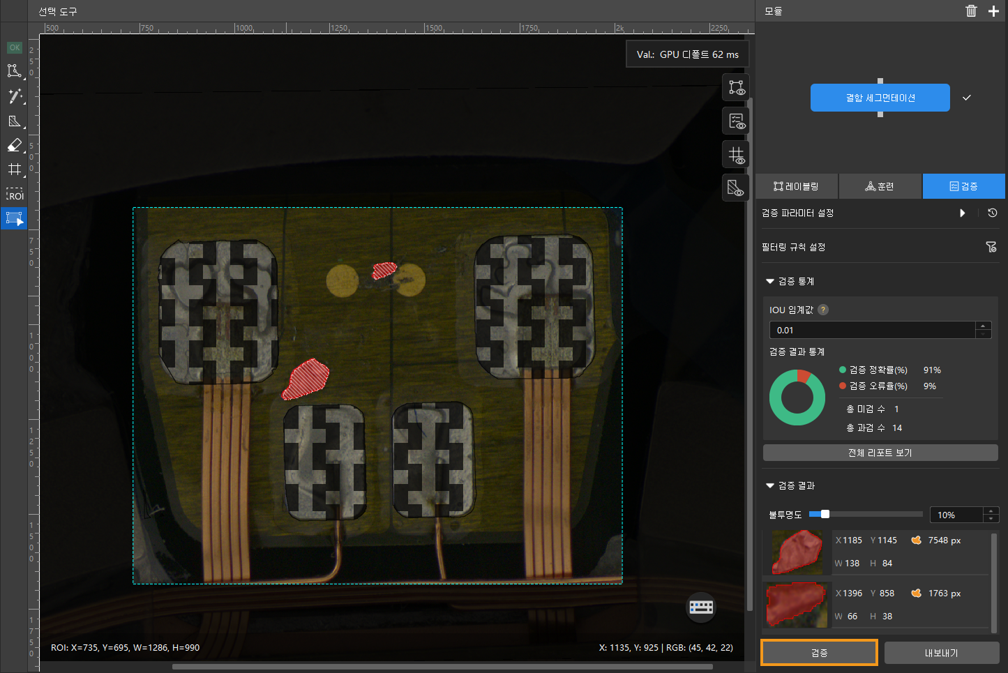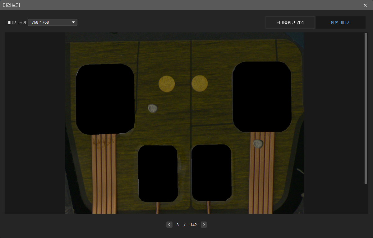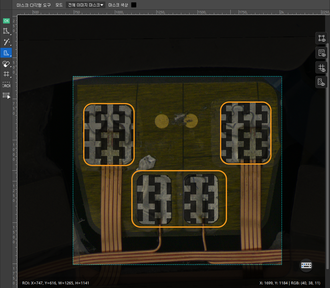 ROI 조정하기 : 각 이미지의 결함 위치가 서로 비슷한 경우, ROI 도구를 사용하여 모델 훈련에 적합한 ROI 영역을 선택할 수 있습니다. ROI를 설정하면 관련 없는 배경 정보 간섭을 줄일 수 있습니다. 본 예제 프로젝트에서는 모든 결함이 패드에 나타나므로, 레이블링 툴 바에서