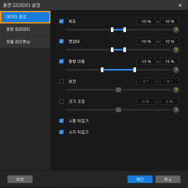 데이터 증강 파라미터 구성 : 원본 데이터를 기반으로 훈련 데이터를 다양화합니다. 데이터 증강 파라미터의 목적은 훈련 데이터가 제한적일 때 모델의 일반화 성능을 향상시키는 것입니다. 실제 상황에 맞게 데이터 증강 탭의 파라미터를 조정합니다.