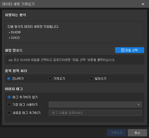 데이터 세트 가져오기를 선택하면 DLKDB 형식(.dlkdb)과 COCO 형식의 데이터세트를 가져올 수 있습니다(예제 데이터 세트 다운로드).