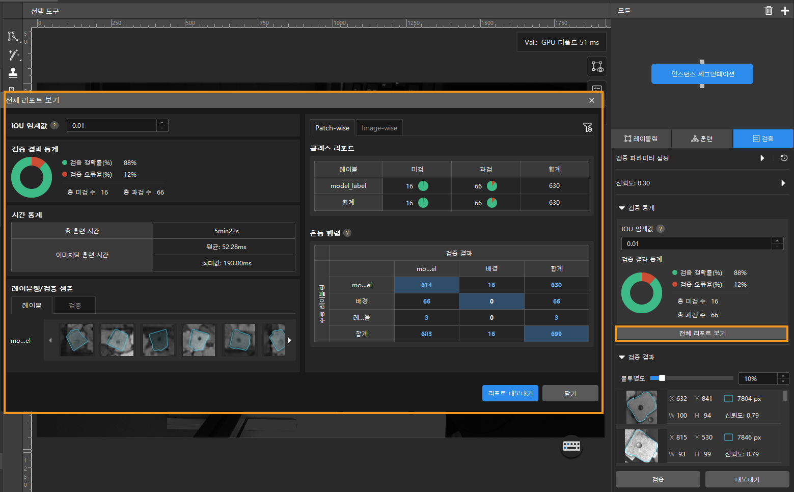 테스트 세트의 모든 미검·과검 이미지를 전부 다시 레이블링하여 훈련 세트로 포함시킬 필요는 없습니다. 일부 이미지만 추가로 레이블링하여 훈련 세트에 포함한 뒤, 모델을 다시 훈련 및 검증하고, 나머지 이미지는 참고용으로 사용하여 검증 결과를 관찰함으로써 모델의 반복 개선 효과를 점검할 수 있습니다. 전체 리포트 보기 창의 오른쪽 하단에 위치한 리포트 내보내기 버튼을 클릭하면, 썸네일 이미지 또는 원본 이미지 형태로 리포트를 내보낼 수 있습니다.