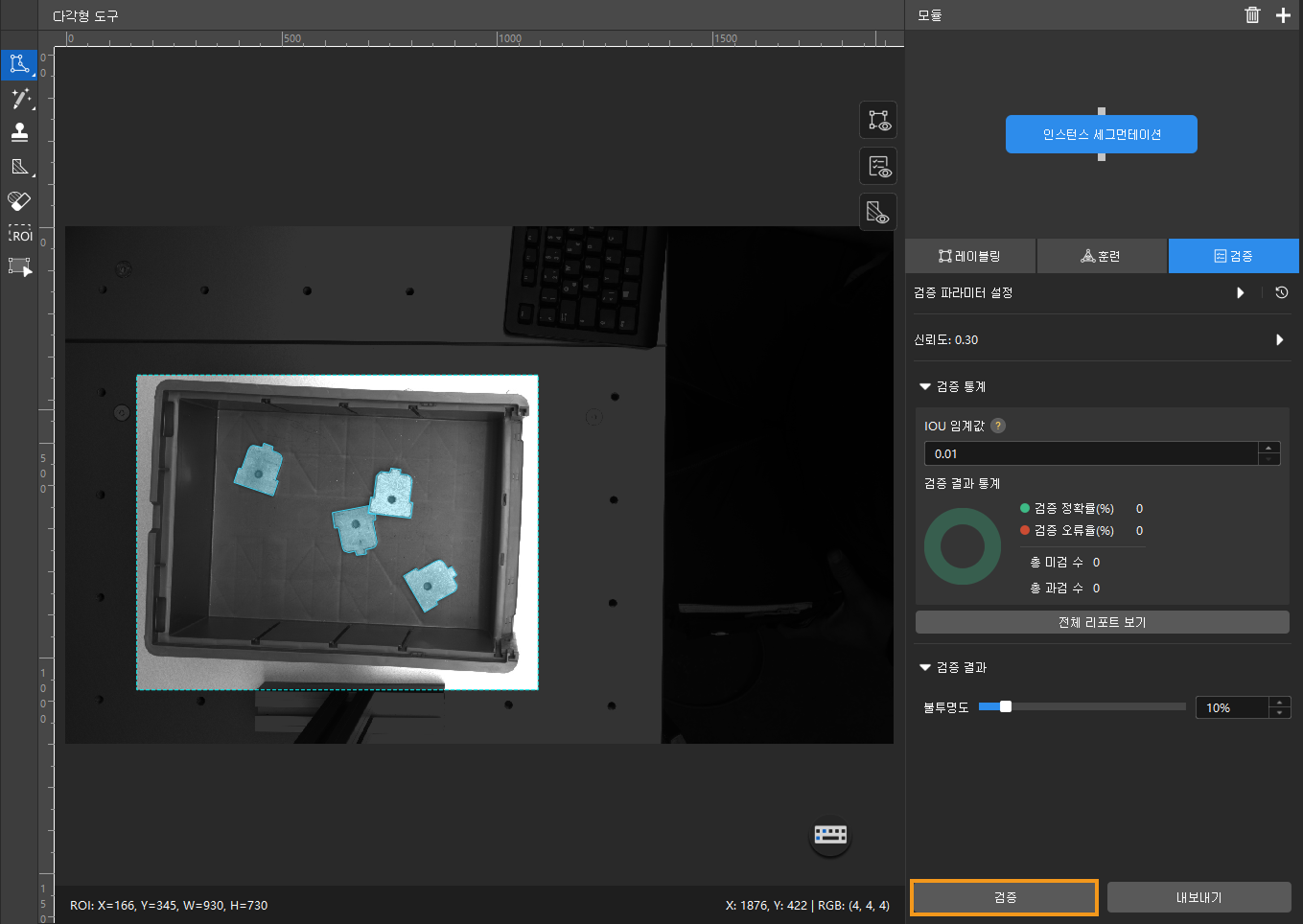 모델 검증 결과 확인 : 검증이 완료되면, 검증 탭의 검증 통계에서 검증 결과를 확인할 수 있습니다.