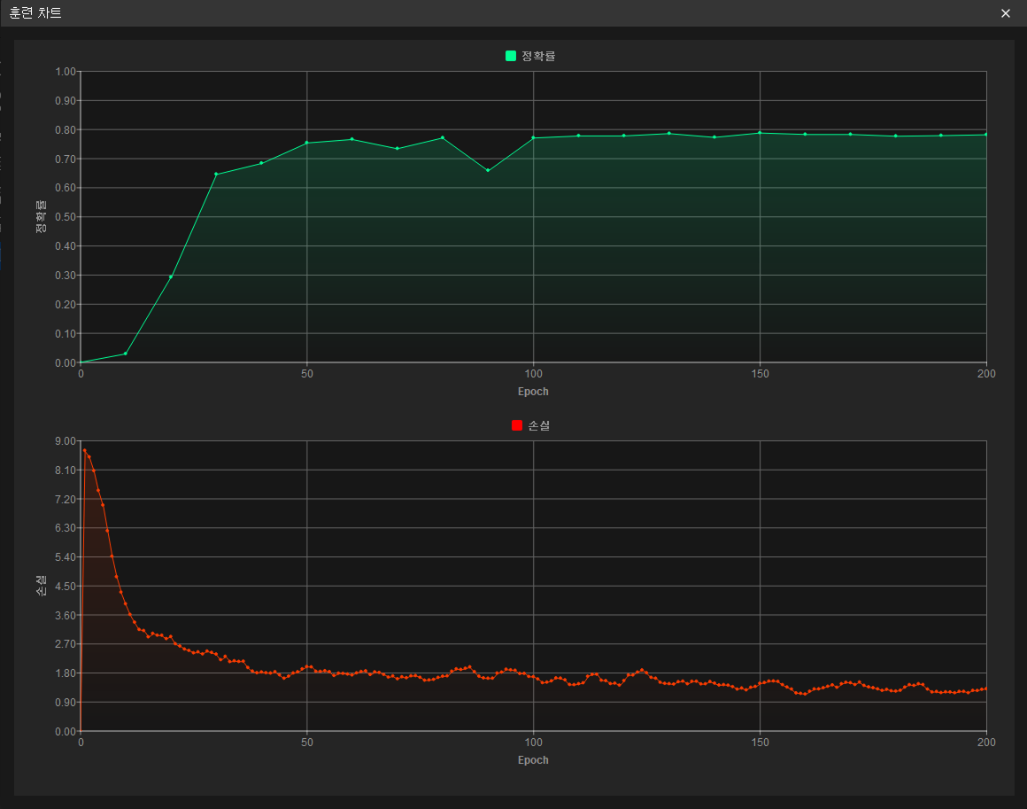 훈련 차트를 통해 훈련 상태 확인 : 훈련 탭에서 훈련 차트 및 훈련 센터 버튼을 클릭하면, 모델 훈련 과정 중 정확도 곡선과 손실 곡선의 변화 및 훈련 상태를 실시간으로 확인할 수 있습니다. 훈련이 완료되면, 최고 정확도 와 테스트 세트 검증 결과를 통해 모델 훈련 효과를 평가합니다. 정확도 곡선이 전반적으로 상승하고, 손실 곡선이 전반적으로 하락하는 추세를 보이면 현재 훈련이 정상적으로 진행되고 있음을 의미합니다.