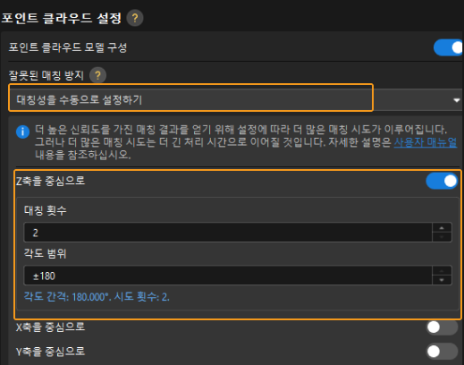 대상 물체 편집기의 '포인트 클라우드 모델 구성' 프로세스에서 '매칭 결과 필터링 위한 포즈 계산' 방식을 대칭성을 수동으로 설정하기로 선택하고 대칭 축을 선택한 후 대칭 횟수 및 각도 범위를 설정합니다.