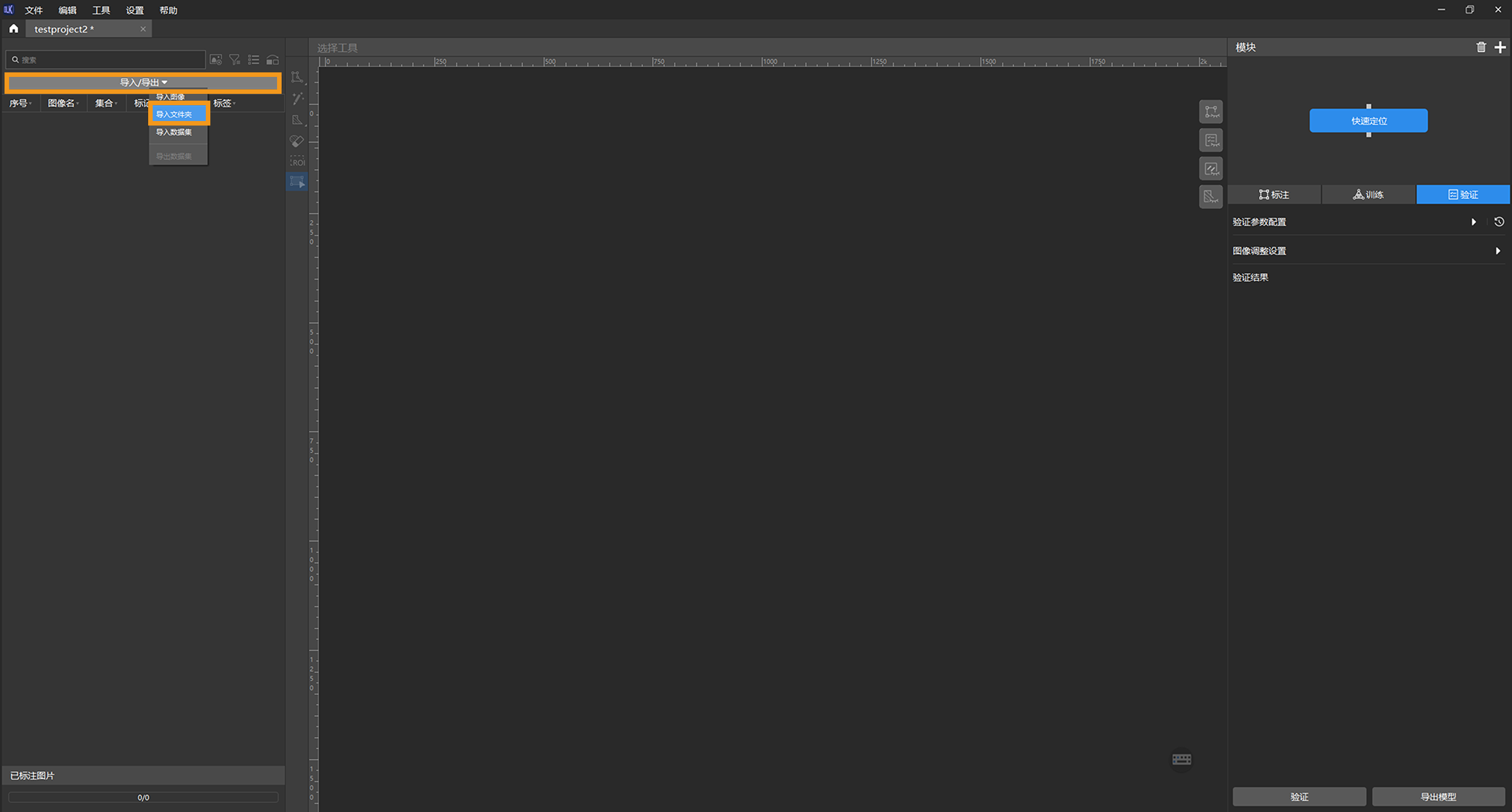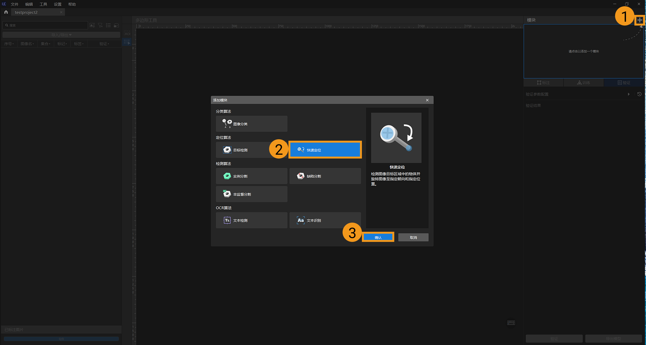 新建工程并添加快速定位模块:单击初始显示页面上的 新建工程 ,选择工程路径并输入工程名以新建一个工程。再单击右上角的