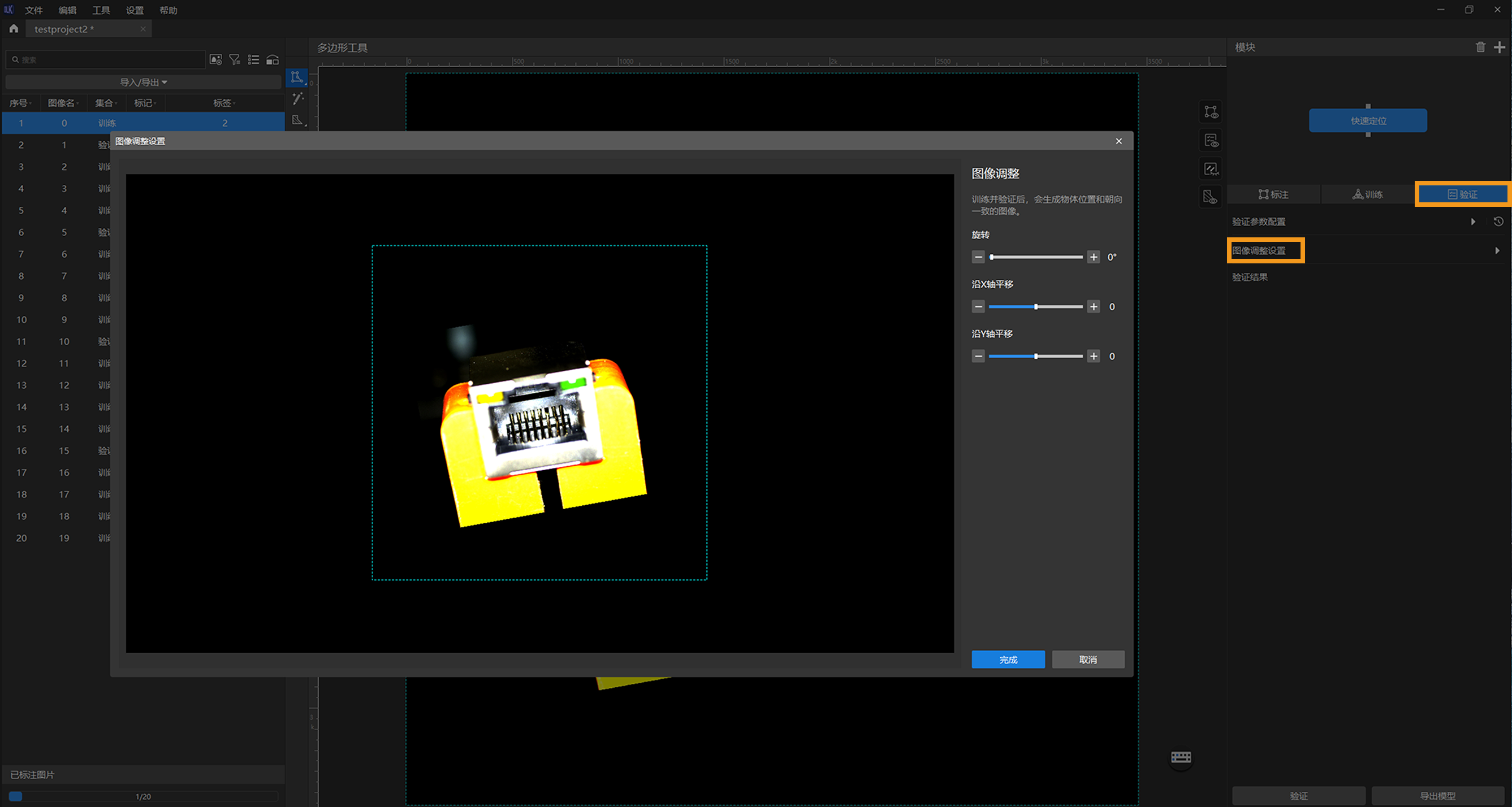 调整图像:训练结束后,在验证参数栏单击图像调整设置,拖动滑块或单击 - 和 + 调整图像到期望朝向和位置,单击完成。