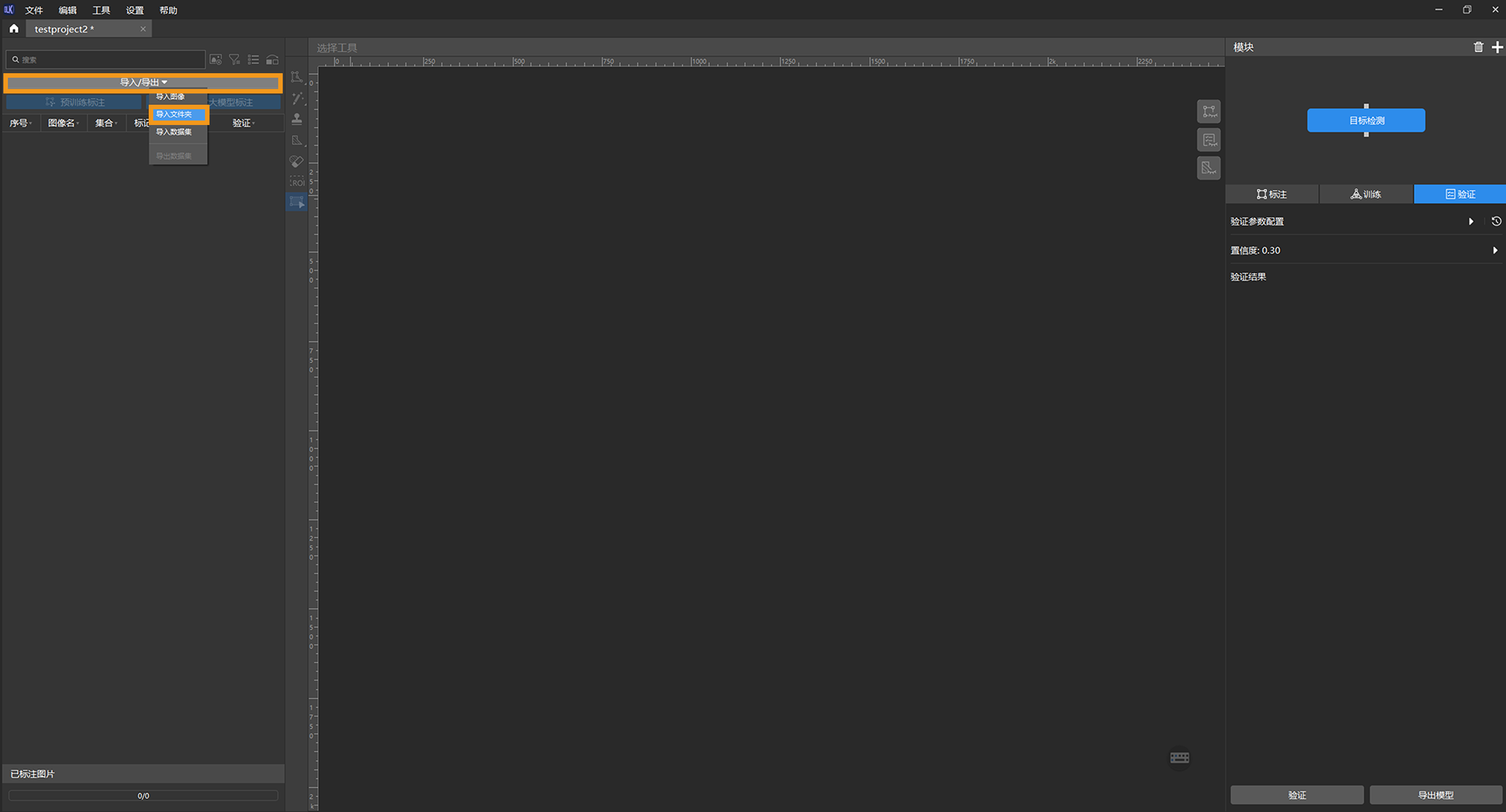 新建工程并添加“目标检测”模块:单击初始页面上的 新建工程 ,选择工程路径并输入工程名以新建一个工程。再单击右上角的