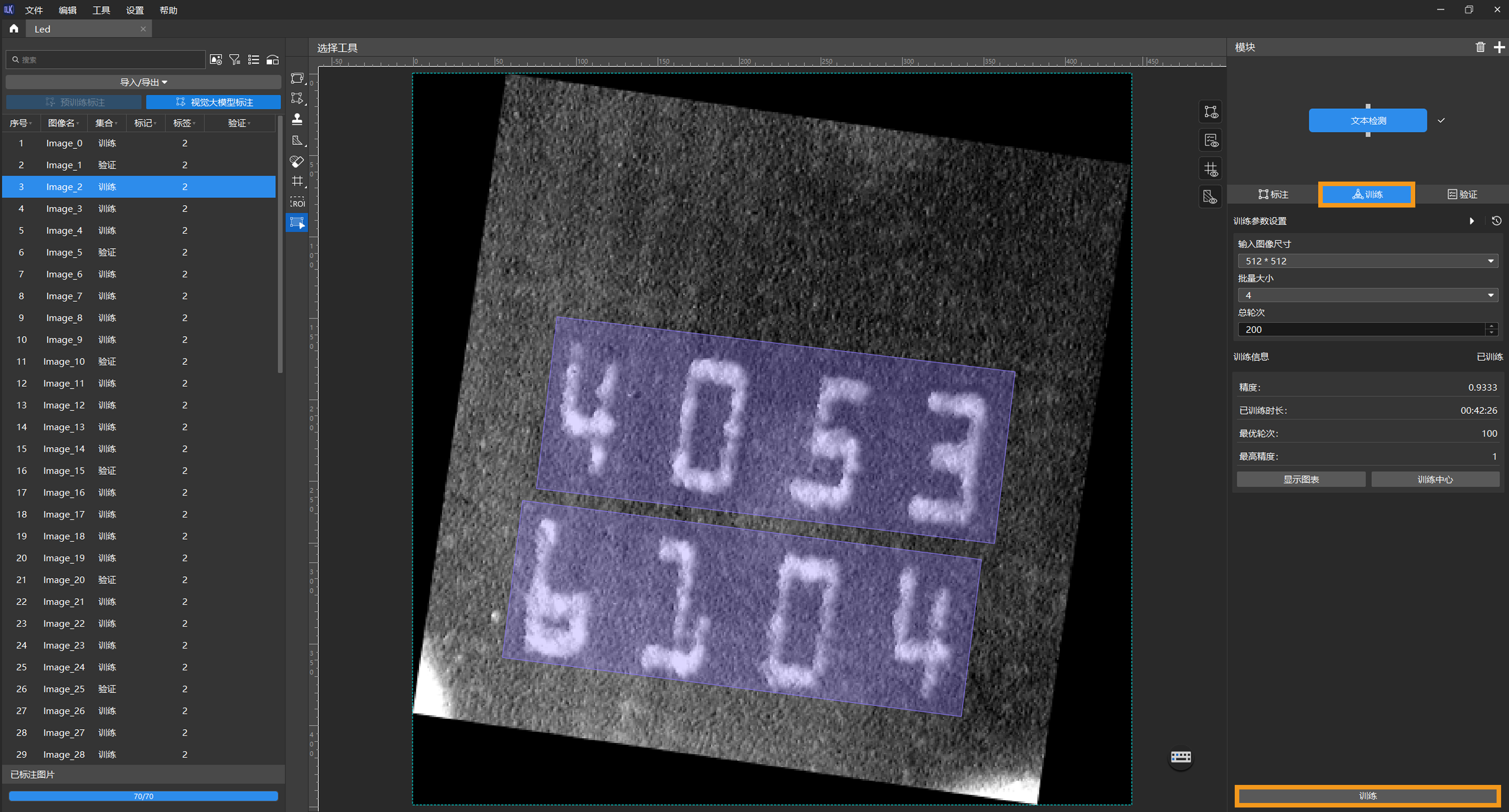 训练模型:使用默认参数设定,单击训练开始训练模型。