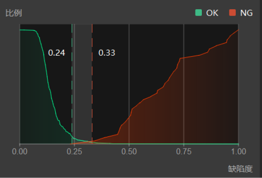 在缺陷度统计图中,绿色曲线的纵坐标表示在验证集中,缺陷度高于横坐标对应缺陷度的 OK 图像占所有 OK 图像的比例。红色曲线的纵坐标表示在验证集中,缺陷度低于横坐标对应缺陷度的 NG 图像占所有 NG 图像的比例。当红色曲线与绿色曲线不相交时,可以通过阈值将 OK 与 NG 图完全分开,且两者不相交的区域越大,模型效果越好。