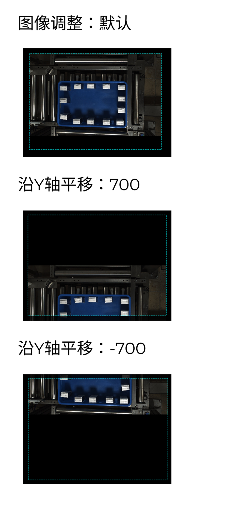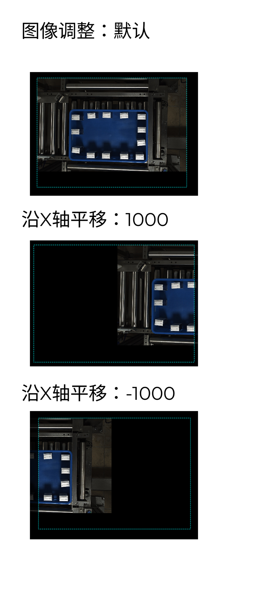 将图像所有的像素坐标分别加上指定的水平偏移量和垂直偏移量。现场物体(料筐、托盘等)位置移动范围较大时,可以通过调整 平移 参数,随机倍增横向、纵向平移的数据。