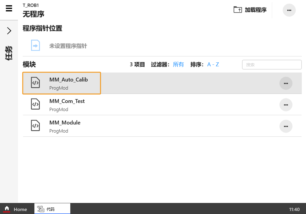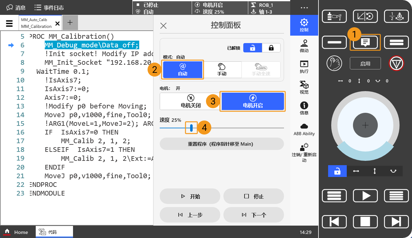 在手动模式下,在MM_Auto_Calib程序界面的右侧菜单中,依次点击。