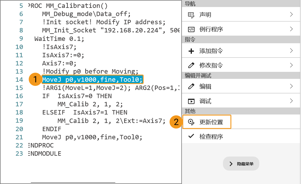 选中如下代码行,在右侧菜单中,点击更新位置。在弹出的窗口中,点击更新,便可将机器人当前位姿保存到p0。