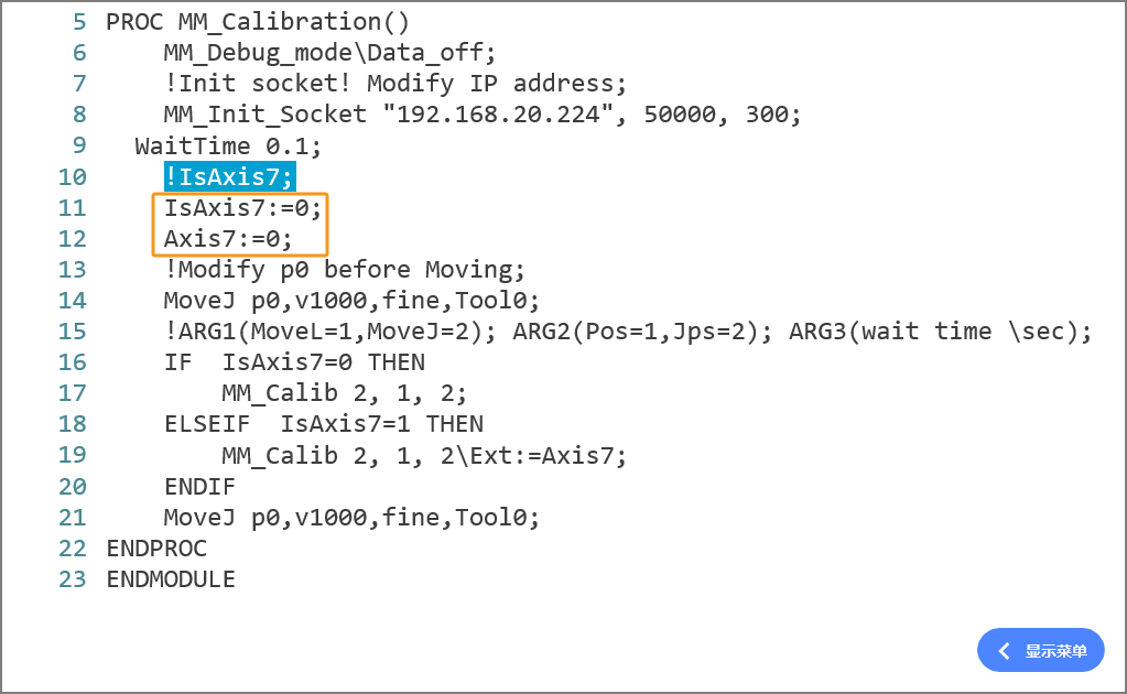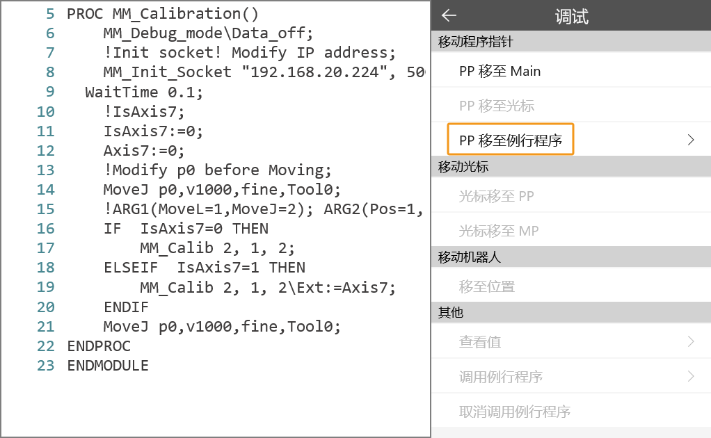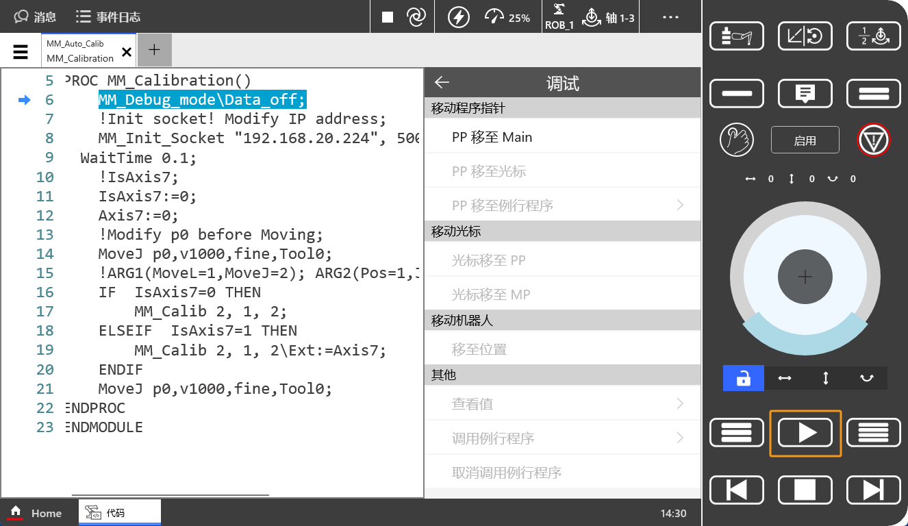 在手动模式下,选择,在T_ROB1下找到并打开MM_Auto_Calib程序模块。确认程序中MM_Init_Socket指令的IP地址为工控机IP地址,且端口号为Mech-Vision软件中设置的主机端口号。具体操作可参考选择和修改通信测试程序。
