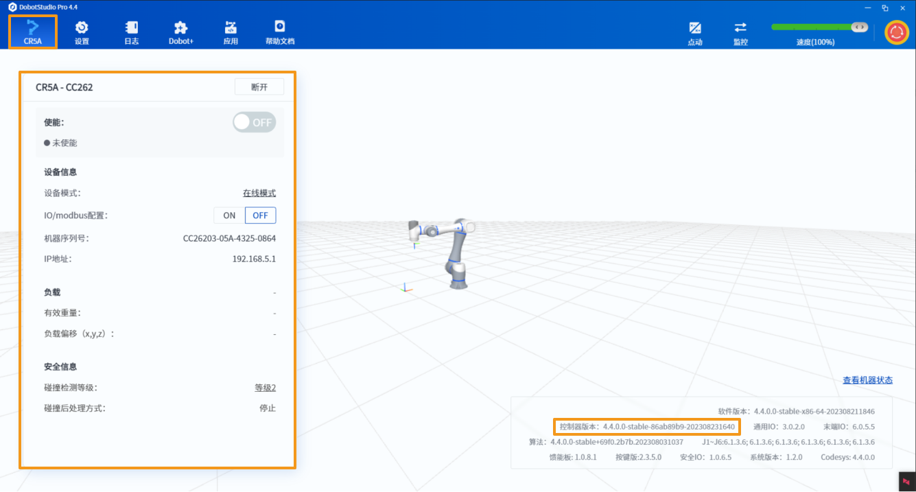 进行本步骤前,请确保已使用DobotStudio Pro软件连接机器人。连接机器人步骤请参见本文查看控制器版本区域步骤1。 -
