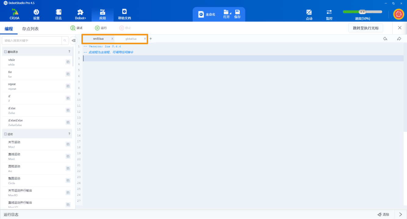 在DobotStudio Pro软件主界面,点击应用。在应用页面,点击脚本编程,新建一个脚本编程工程。新建的脚本编程工程中包含两个空白文件:src0.lua和global.lua,如下图所示。