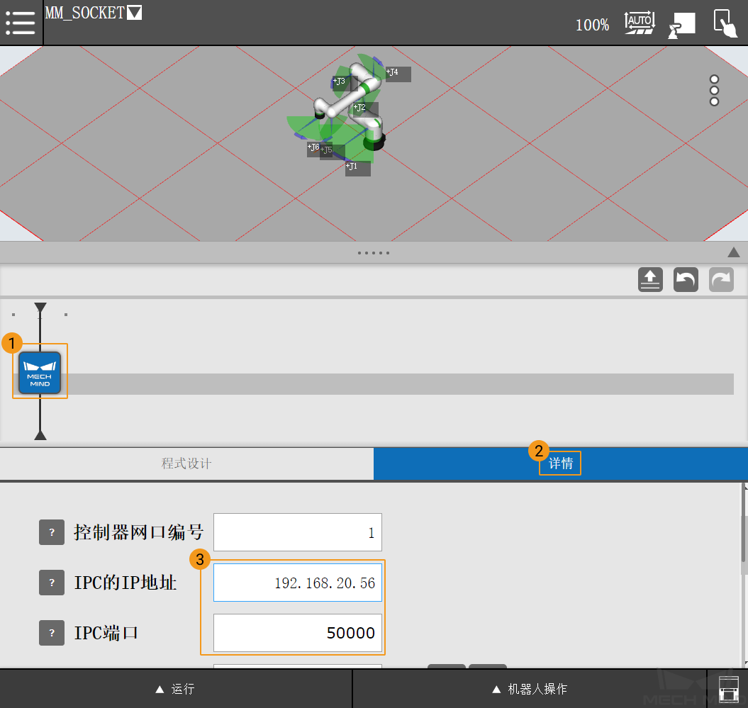 单击拖入的指令,进入该指令的详情页面。将此处的 IPC 的 IP 地址 设置为工控机 IP,将 IPC 端口 设置 Mech-Vision 中配置的端口号。