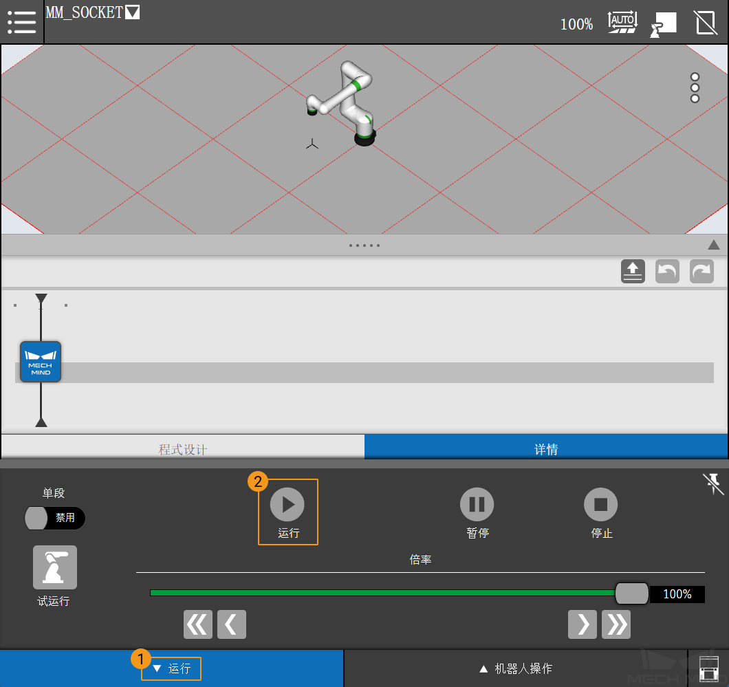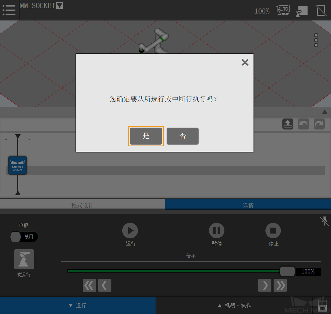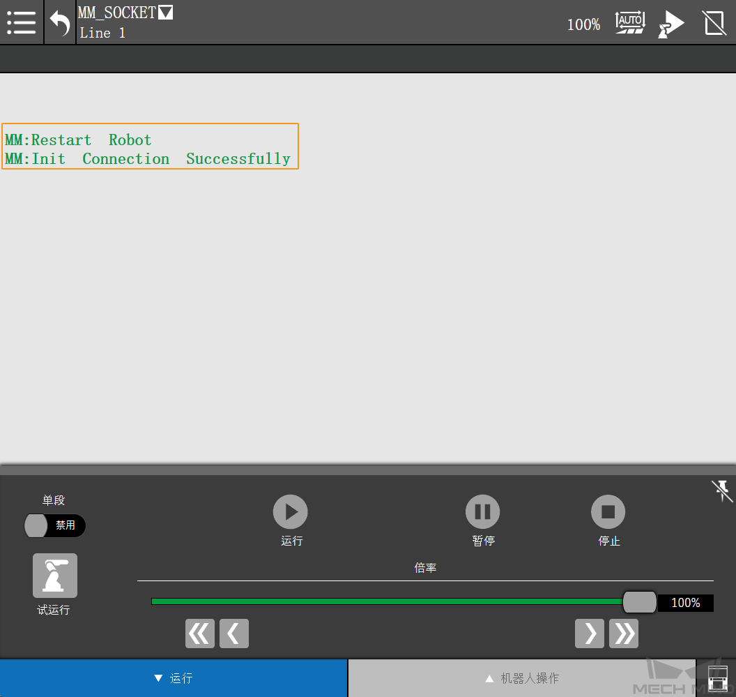 若示教器界面显示“MM: Restart Robot”或页面未自动跳转,请手动关闭并重启控制器,然后重新运行上述程序。