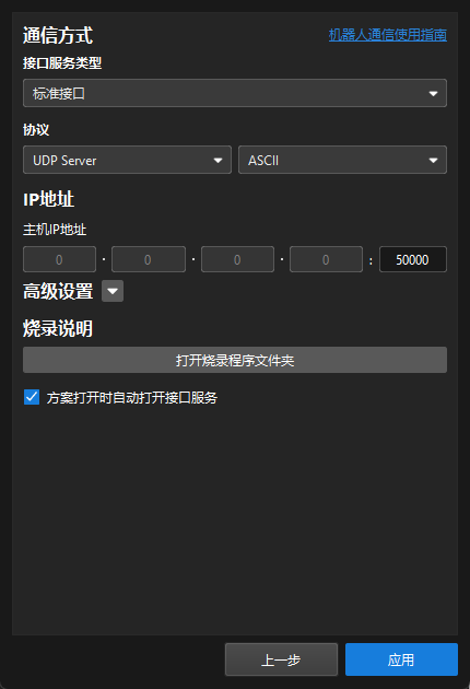 在 通信方式 下,接口服务类型 选择 标准接口 ,协议 选择 UDP Server,协议格式 选择 ASCII。