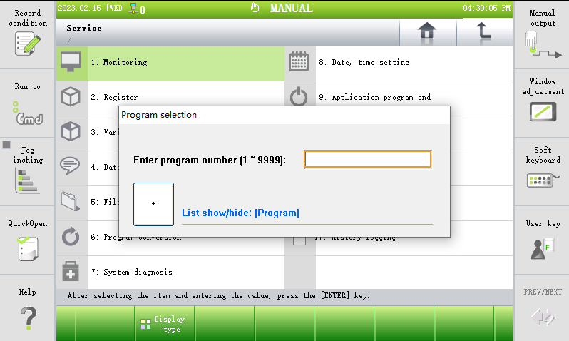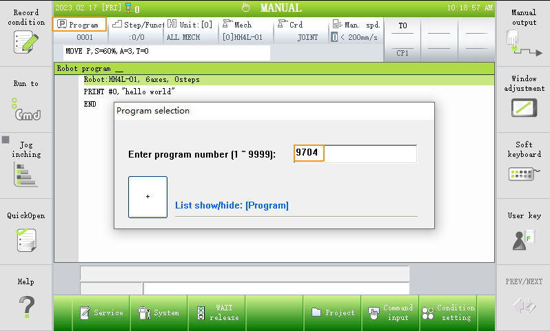 在示教器界面,点击左上角 Program 区域,在输入框内输入 9704,打开 9704 程序。