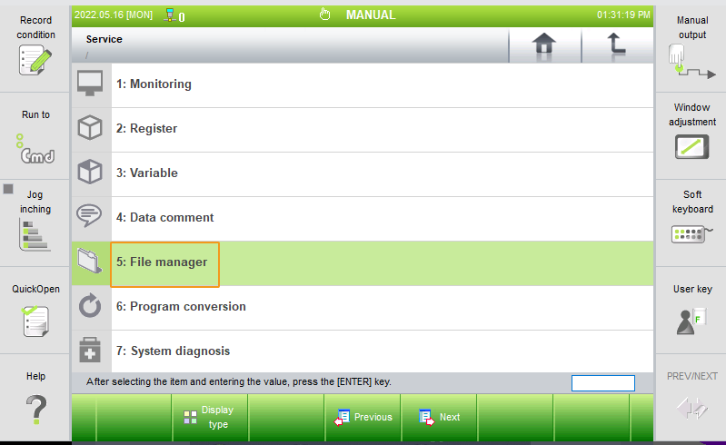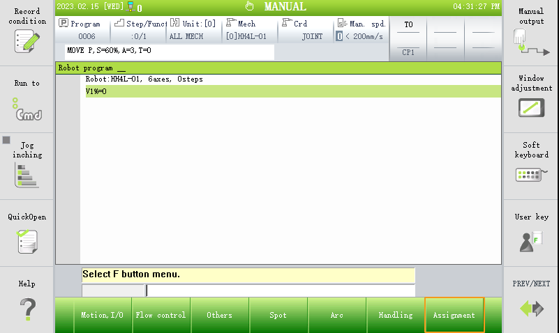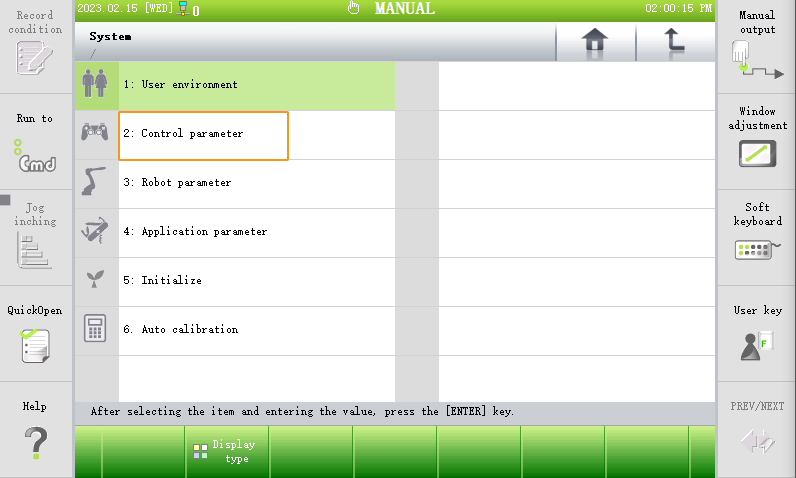 在 Pose record type 处,按住示教器上的 Shift 按钮并按左/右箭头按钮,选择 Axis 。