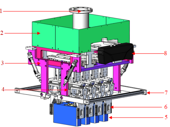 1 法兰 2 罩壳 3 拖底气缸 4 夹爪气缸 5 工件 6 夹爪 7 拖底 8 相机 |