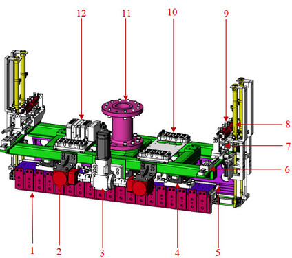 1 动夹指 2 换向器 3 减速器 4 动夹指导轨 5 传感器 6 导轨 7 导轨 8 笔形气缸 9 气缸 10 远程模块 11 法兰 12 气动模块 |