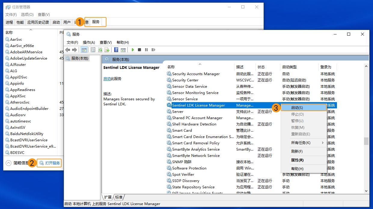 在任务管理器菜单栏中选择服务后,在底部单击打开服务按钮,然后右键单击Sentinel LDK License Manager,最后在快捷菜单中选择启动,以启动Sentinel LDK License Manager服务。
