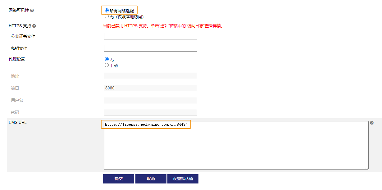 在Sentinel Admin Control Center页面的中设置“网络可见性”为所有网络适配,并在底部“EMS URL”处添加“https://license.mech-mind.com.cn:8443/”,然后单击提交按钮。