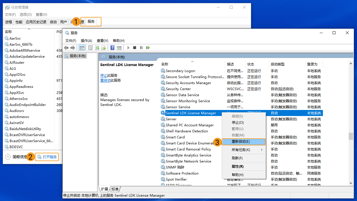 在任务管理器菜单栏中选择服务后,在底部单击打开服务按钮,然后右键单击Sentinel LDK License Manager,最后在快捷菜单中选择重新启动,以重新启动Sentinel LDK License Manager服务。