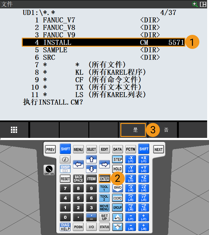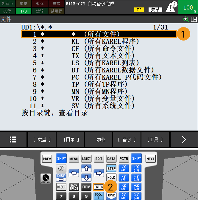 若U盘插入控制柜,使用方向键选择选择USB盘(UD1:),按ENTER键。若U盘插入示教器,使用方向键选择选择TP上的USB(UT1:),按ENTER键。